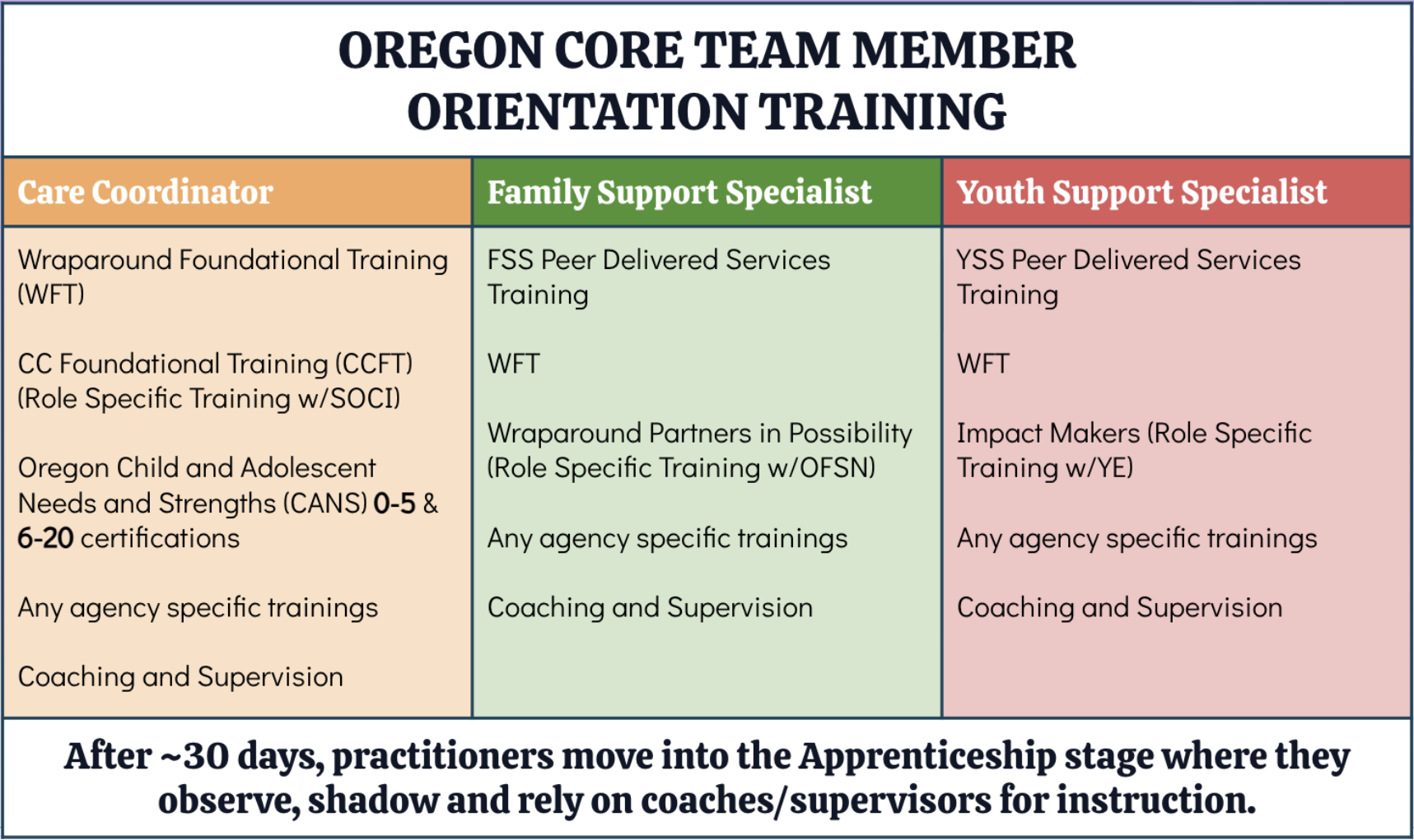 The Oregon Health Authority (OHA) has made changes to the Wraparound training process. All Oregon Wraparound practitioners hired after August 1,2025 are now required to attend the Wraparound Foundational Training Introduction (WFT) and core team members are required to attend additional role-specific training.